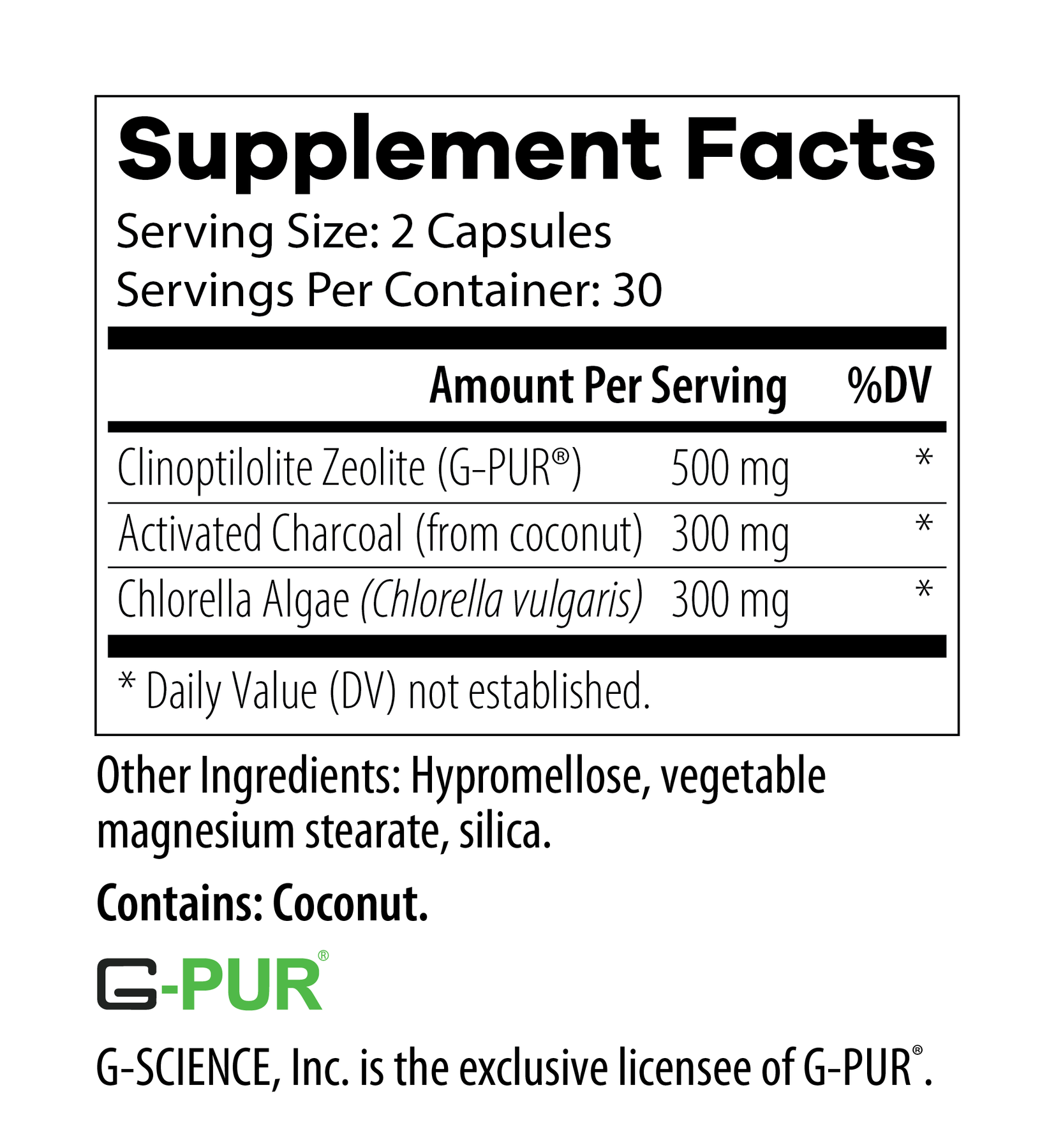 Ingredients: Clinoptilolite zeolite (G-PUR®), Activated Charcoal (from coconut), Chlorella algae (Chlorella vulgaris)